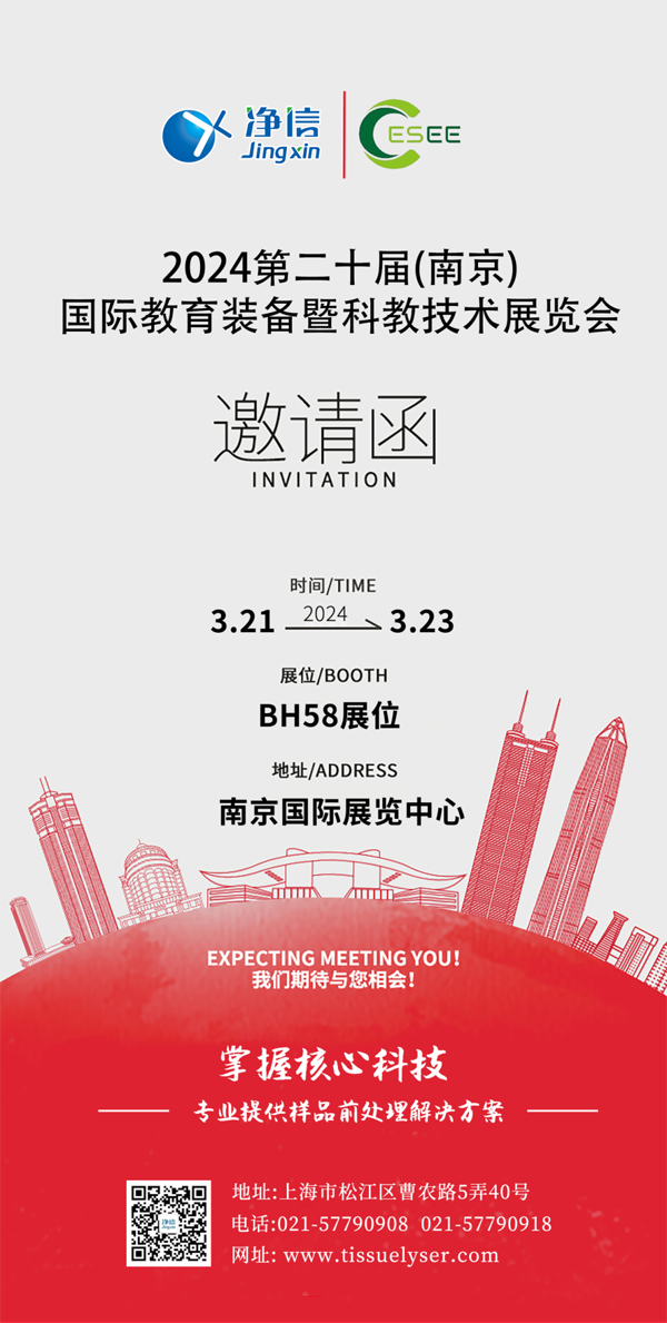 2024年3月21日至3月23日,第二十屆中國南京國際教育裝備暨科教技術展覽會,將會在南京國際展覽中心舉辦。上海凈信將攜多款新產品出席亮相,包括凈信科研者系列新品、超聲波設備、研磨設備等等。誠摯地邀請您前來BH58展位暢談商機,共話樣品前處理的技術和應用。