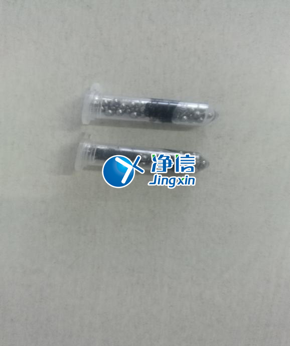 3.在耐磨離心管中先裝入X顆Xmm不銹鋼研磨珠,裝入X小塊剪切好的導電聚合物,再裝入X顆Xmm不銹鋼研磨珠,裝入XUL溶液,蓋好蓋子。